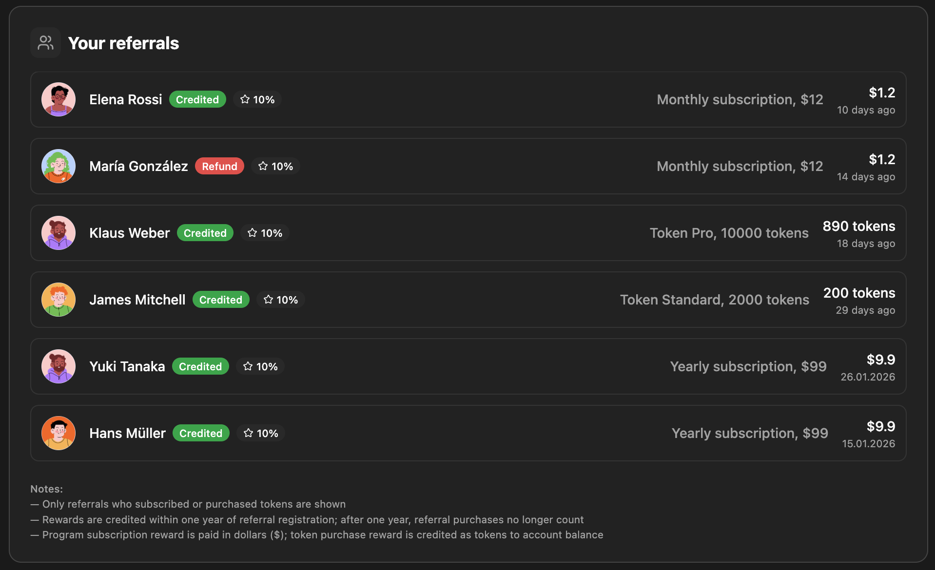 Your referrals: List with avatar, name, status (Credited / Pending / Refund), %, purchase type, reward ($ or tokens), date