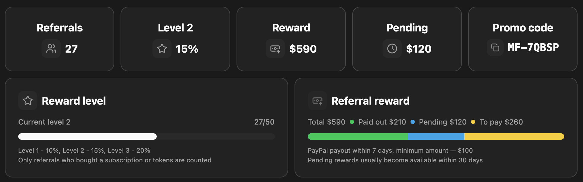 Reward level: Progress bar to next level (e.g. 27/50); 10% / 15% / 20%; only referrals who bought subscription or tokens count