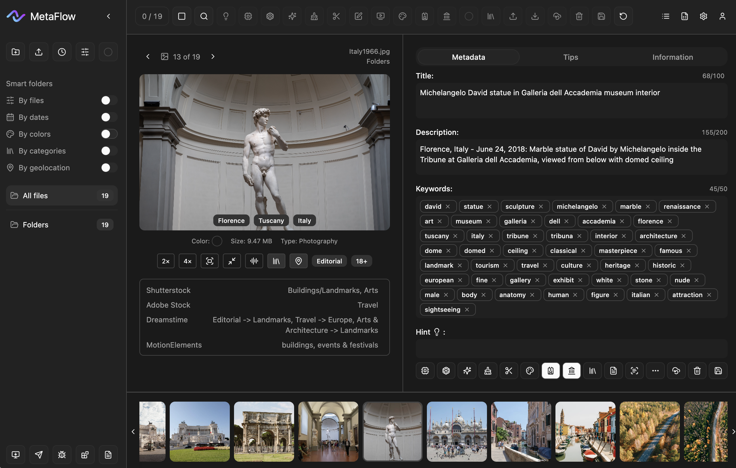 MetaFlow is a desktop app for Mac and Windows. It helps you fill in and edit metadata (title, description, keywords) for photos and videos, prepare files for stock agencies, and organize your library with smart folders and CSV export